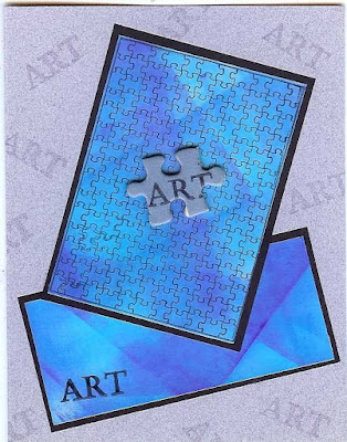 About Art Accents go together don't you? Their puzzle background image is more suited for an ATC but I used it on a card as that is what I best like to make. I just slapped ink pads on some white glossy before stamping the AAA images. The actual puzzle piece on top fits right in....